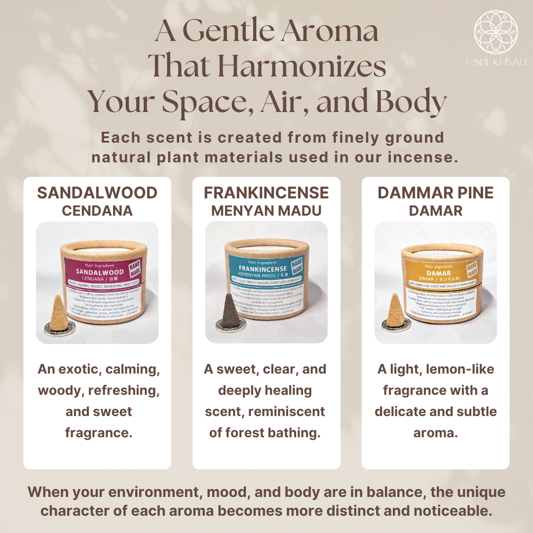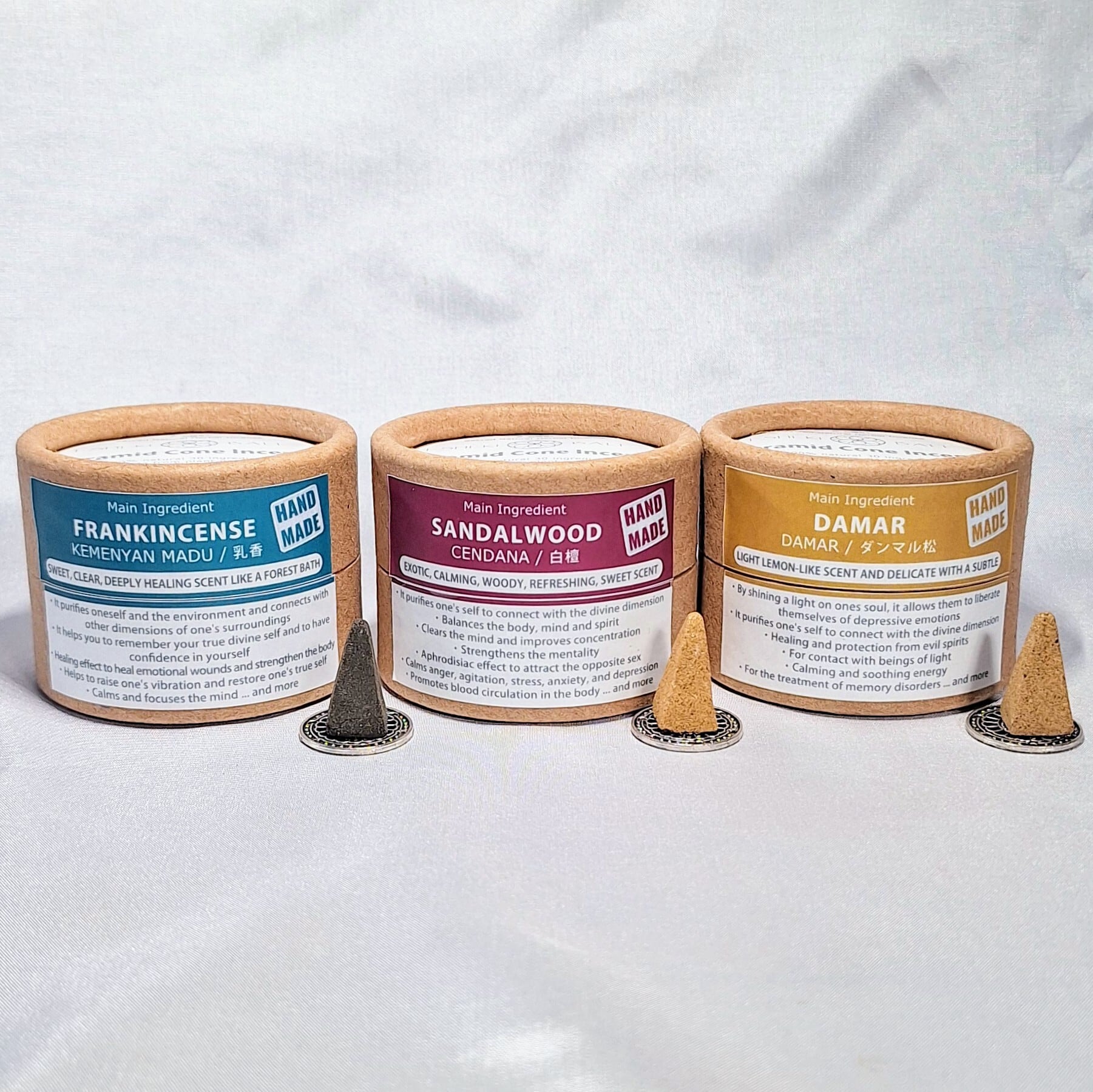 3-Box Set Pyramid Cone Incense with Holder: Sandalwood, Frankincense, Dammar (12 Cones/Box x 3). Sacred Natural Herbal Incense by ISHIKI-BALI.