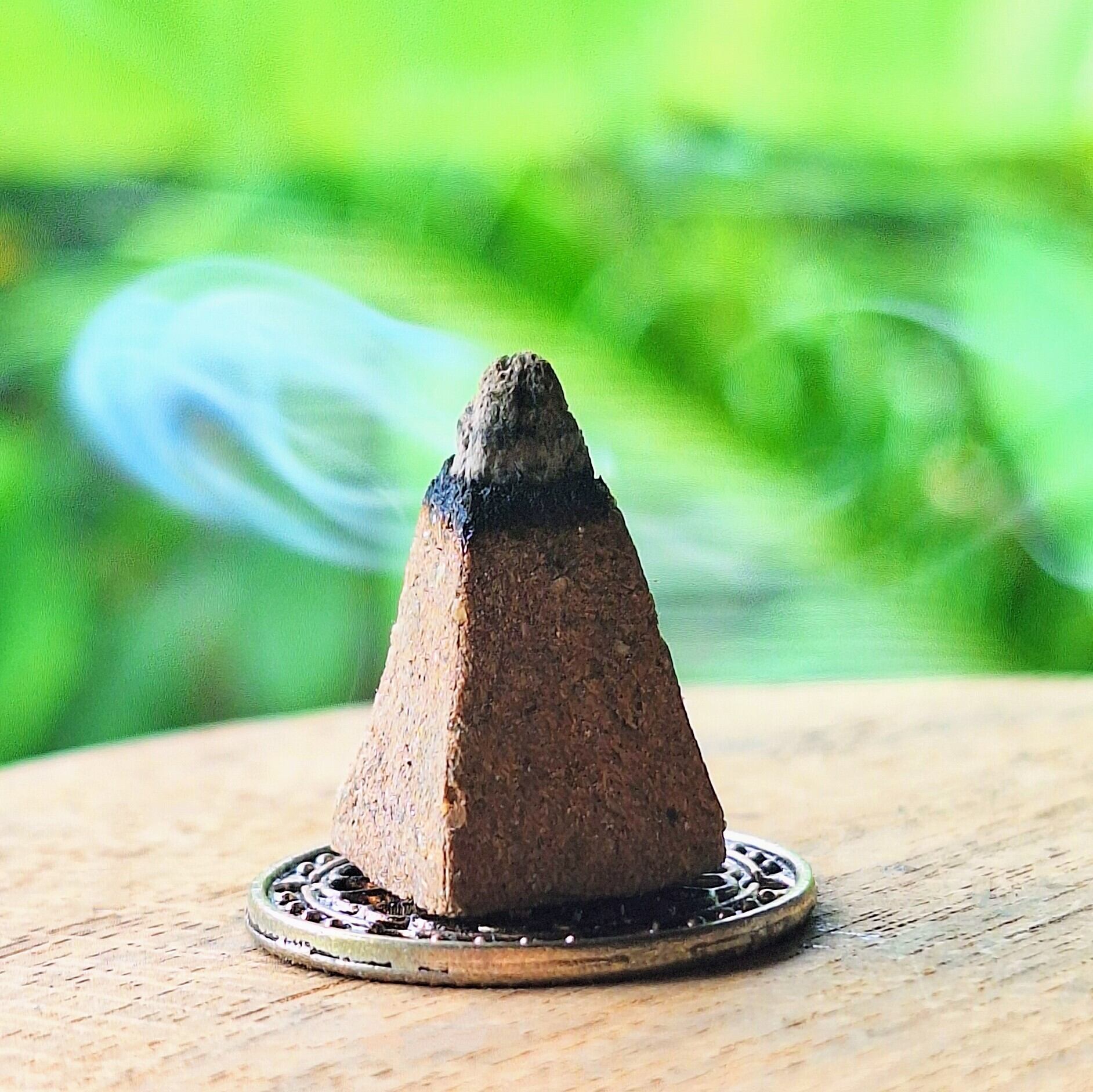 Light the tip of the cone incense, then gently blow out the flame. (Lighting it a little longer helps the ember settle.)